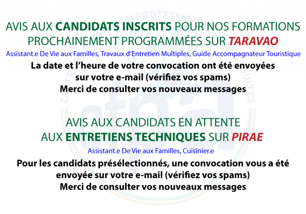 View Post Avis aux candidats inscrits pour nos formations prochainement programmées sur Taravao et aux candidats en attente aux entretiens techniques sur Pirae CFPA 8 septembre 2021 Actualités