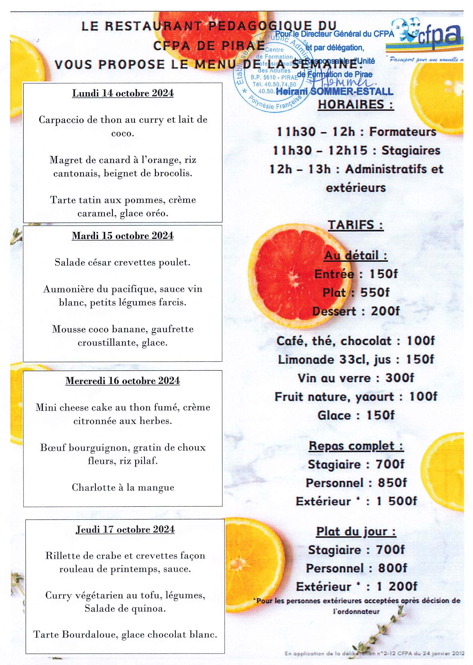 View Post Menu du restaurant pédagogique de Pirae du 14 au 17 Octobre 2024 CFPA 11 octobre 2024 Menu du restaurant de Pirae