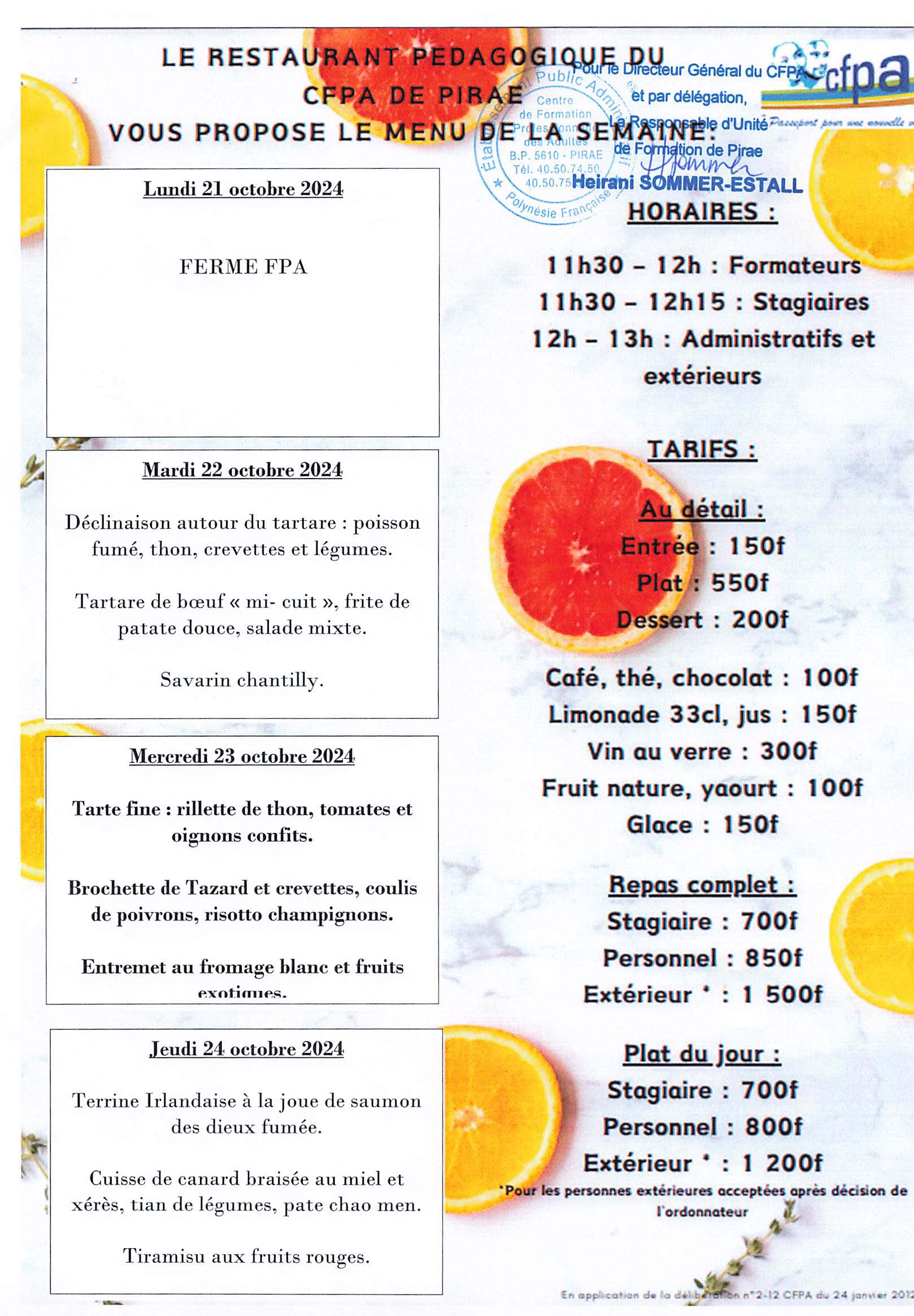 View Post Menu du restaurant pédagogique de Pirae du 22 au 24 Octobre 2024 CFPA 17 octobre 2024 Menu du restaurant de Pirae