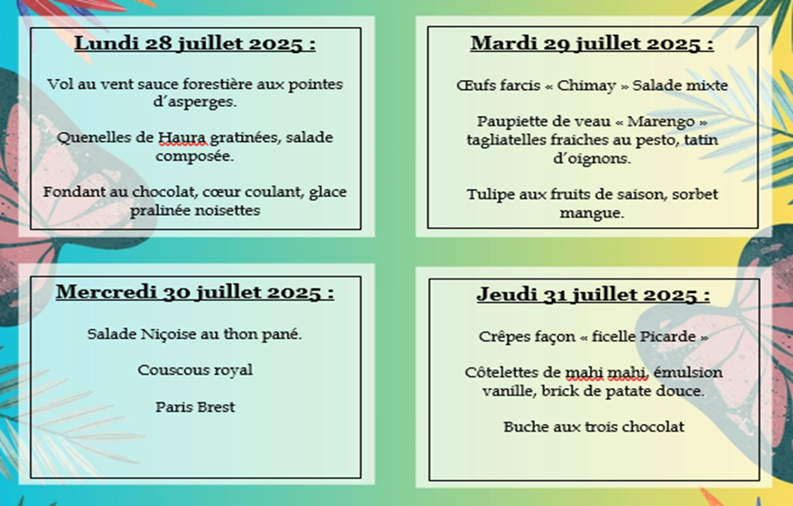 View Post Menu du restaurant pédagogique de Pirae du 28 au 31 Juillet 2025 CFPA 25 juillet 2025 Menu du restaurant de Pirae