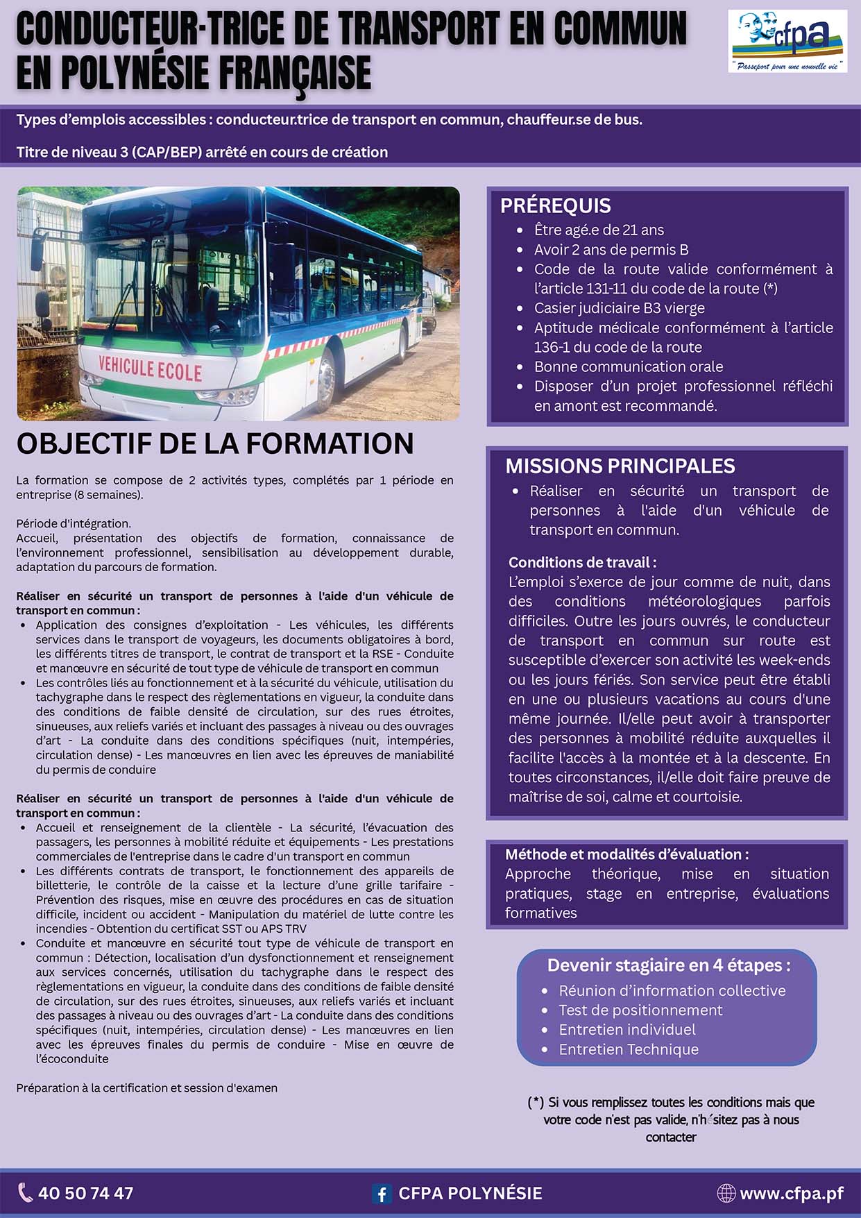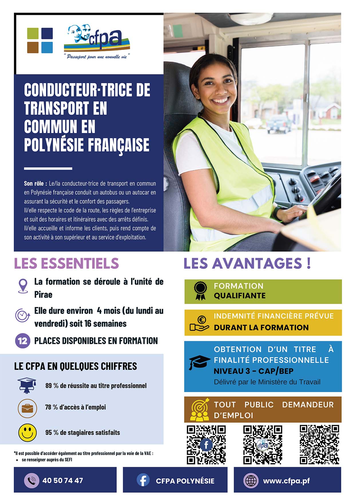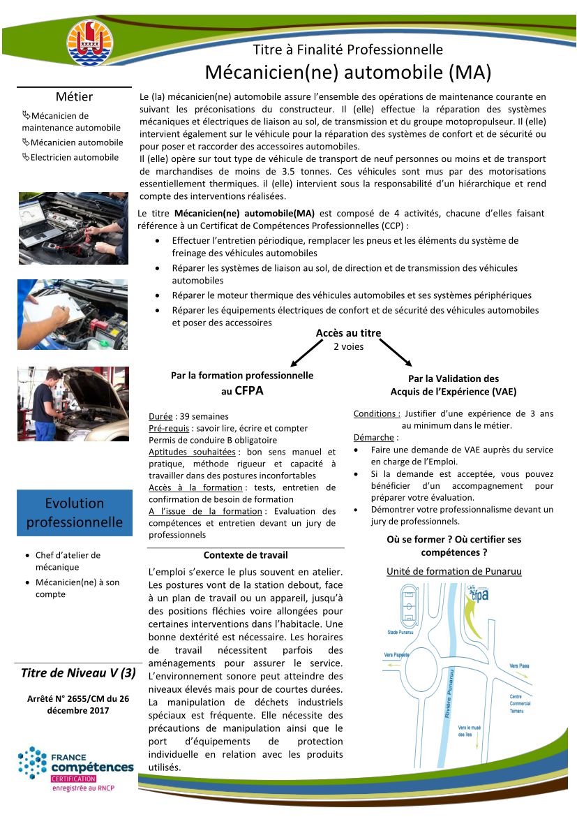 Télécharger la fiche de formation S'inscrire à l'unité de Formation Itinérante Télécharger la fiche de formation S'inscrire à l'unité de Punaruu Besoin de renseignement ? Contactez-nous Besoin de renseignement ? Contactez-nous Où se former ? Où certifier ses compétences ? Unité de Formation Itinérante- Tel : 40 50 74 47