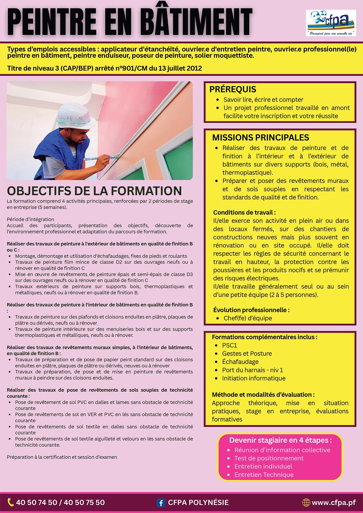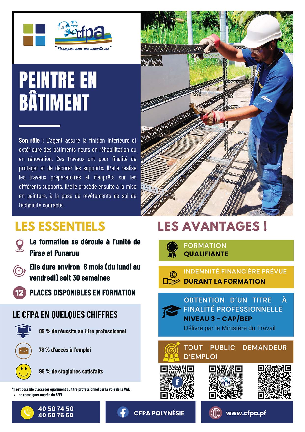 Télécharger la fiche de formation S'inscrire à l'unité de Pirae Télécharger la fiche de formation S'inscrire à l'unité de Pirae Besoin de renseignement ? Contactez-nous Besoin de renseignement ? Contactez-nous Où se former ? Où certifier ses compétences ? Unité de formation de Punaruu - Tel : 40 50 75 50