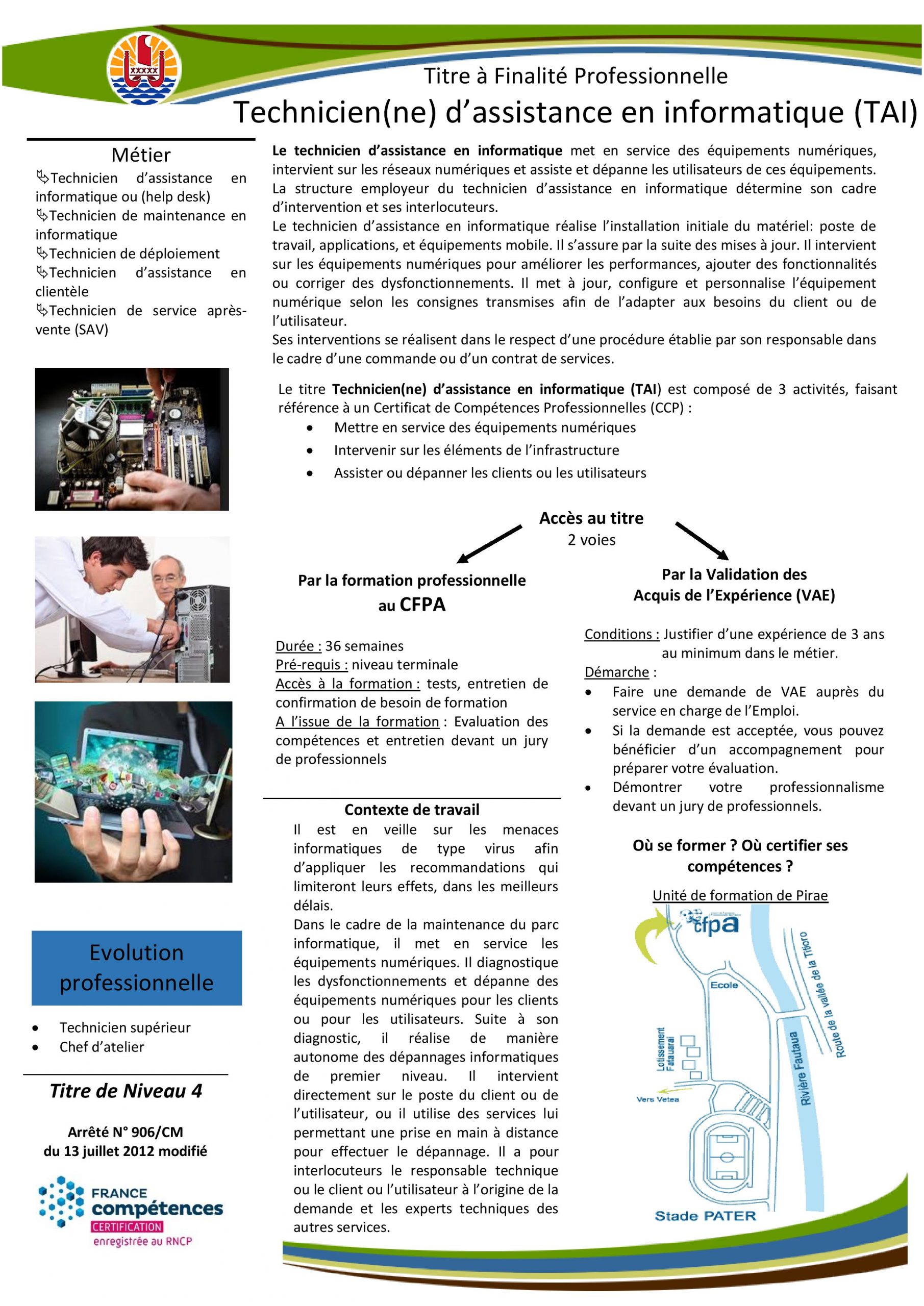 Télécharger la fiche de formation S'inscrire à l'unité de Pirae Télécharger la fiche de formation S'inscrire à l'unité de Pirae Besoin de renseignement ? Contactez-nous Besoin de renseignement ? Contactez-nous Où se former ? Où certifier ses compétences ? Unité de formation de Pirae - Tel : 40 50 74 50