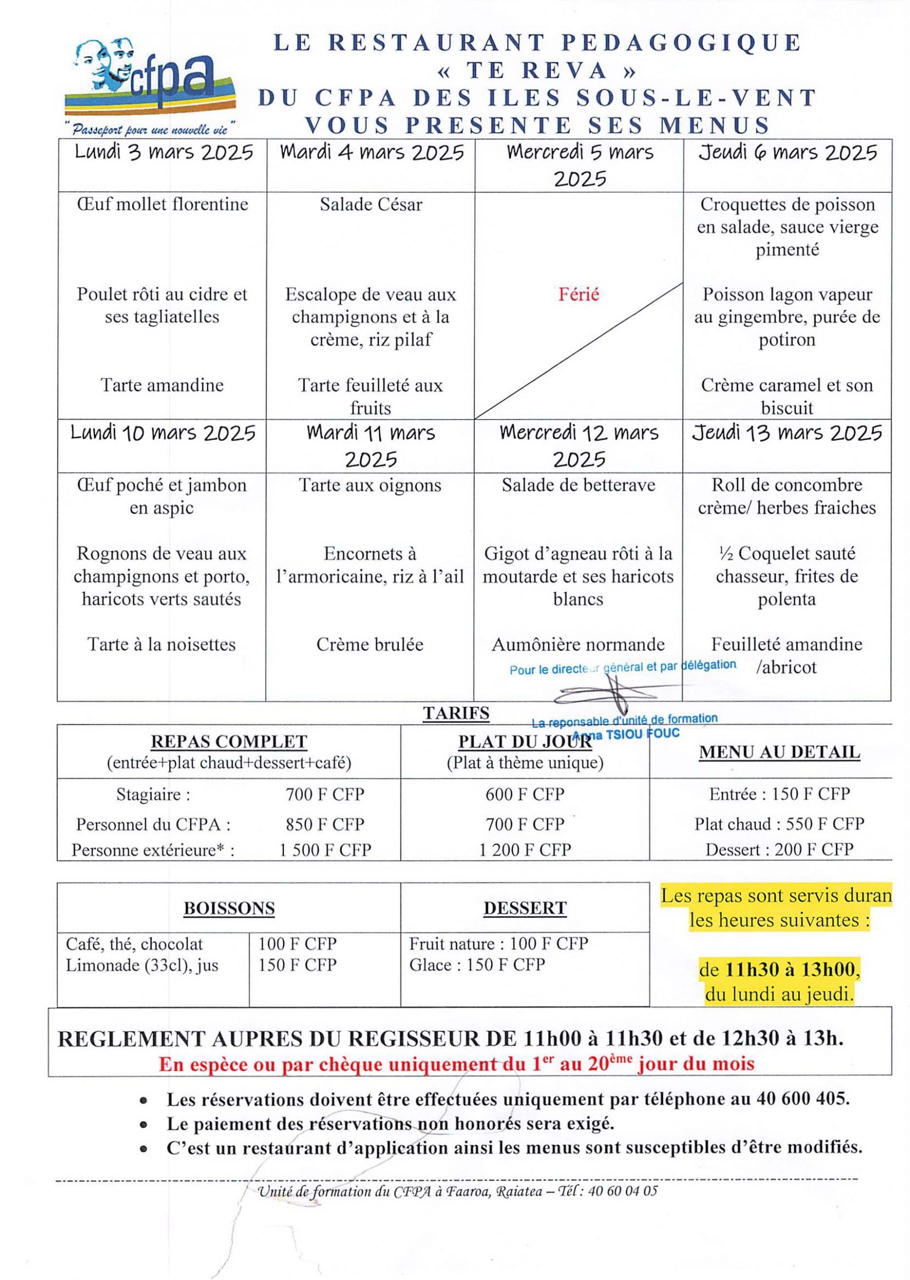CFPA 26 février 2025 Menu du restaurant de Faaroa (Raiatea) Menu du restaurant pédagogique de Faaroa du 03 au 13 Mars 2025