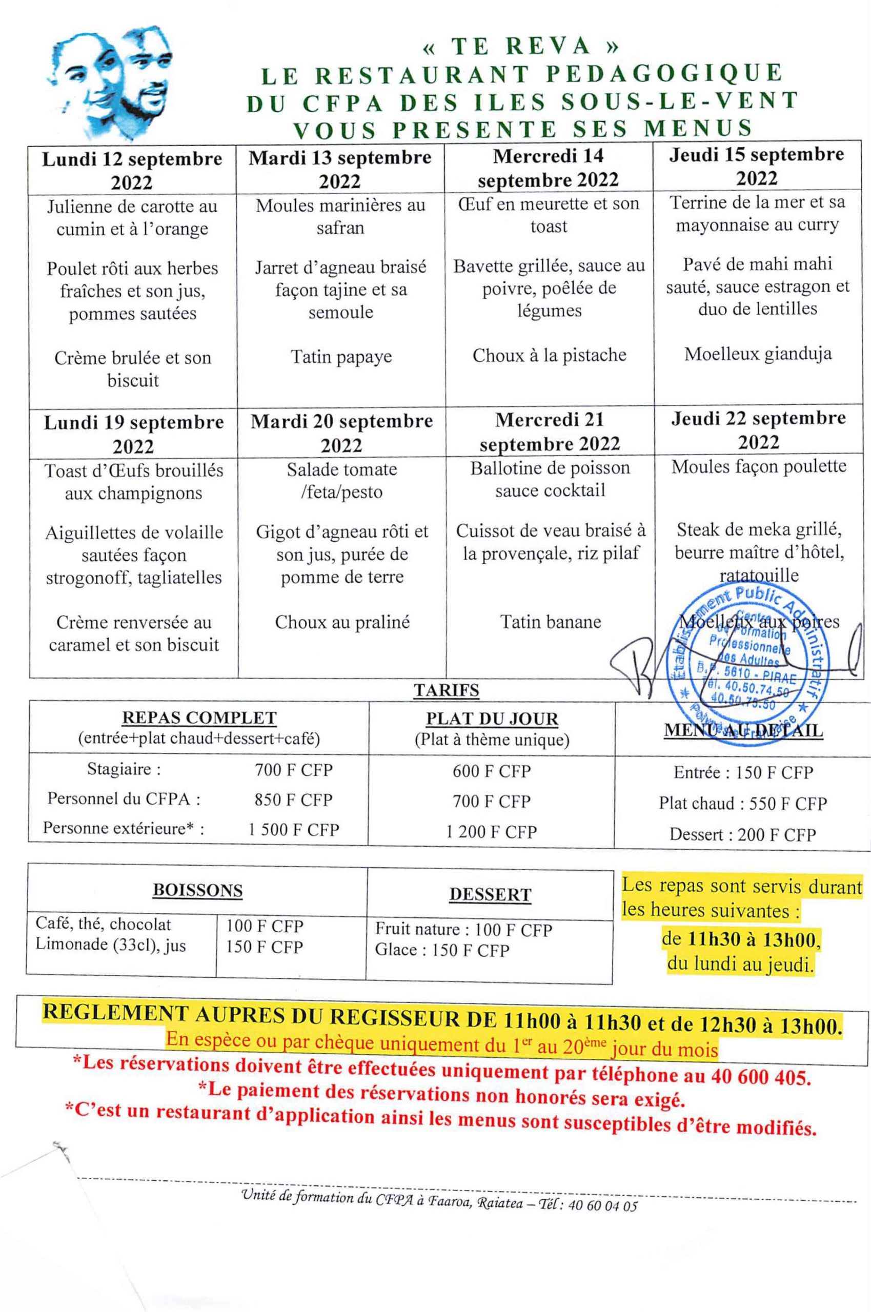 CFPA 8 septembre 2022 Menu du restaurant de Faaroa (Raiatea) Menu du restaurant pédagogique de Faaroa du 12 au 22 Septembre 2022