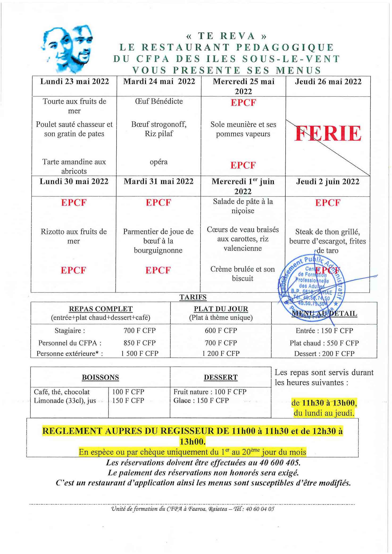 Menu du restaurant pédagogique de Faaroa du 23 Mai au 02 Juin 2022