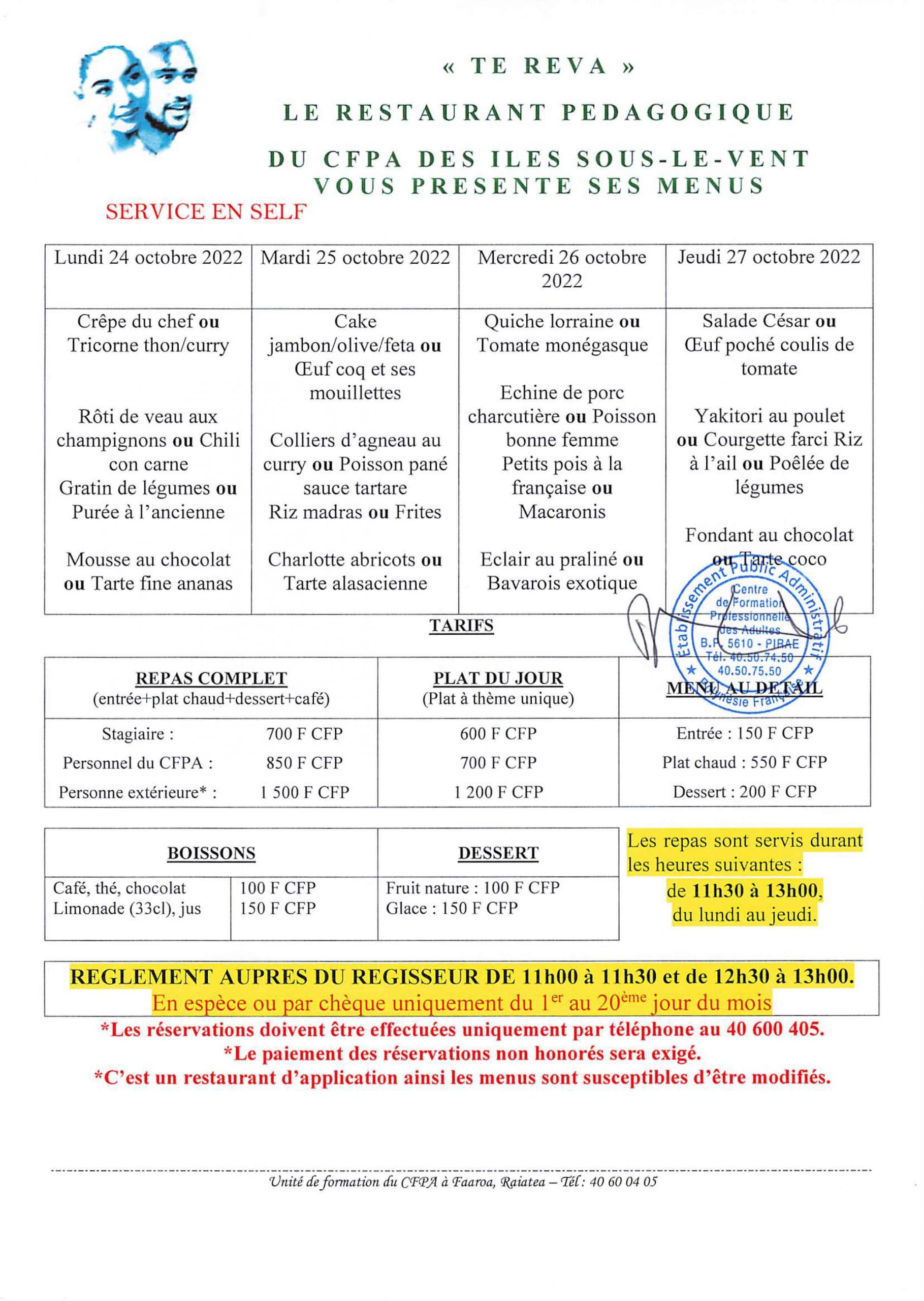 CFPA 20 octobre 2022 Menu du restaurant de Faaroa (Raiatea) Menu du restaurant pédagogique de Faaroa du 24 au 27 Octobre 2022