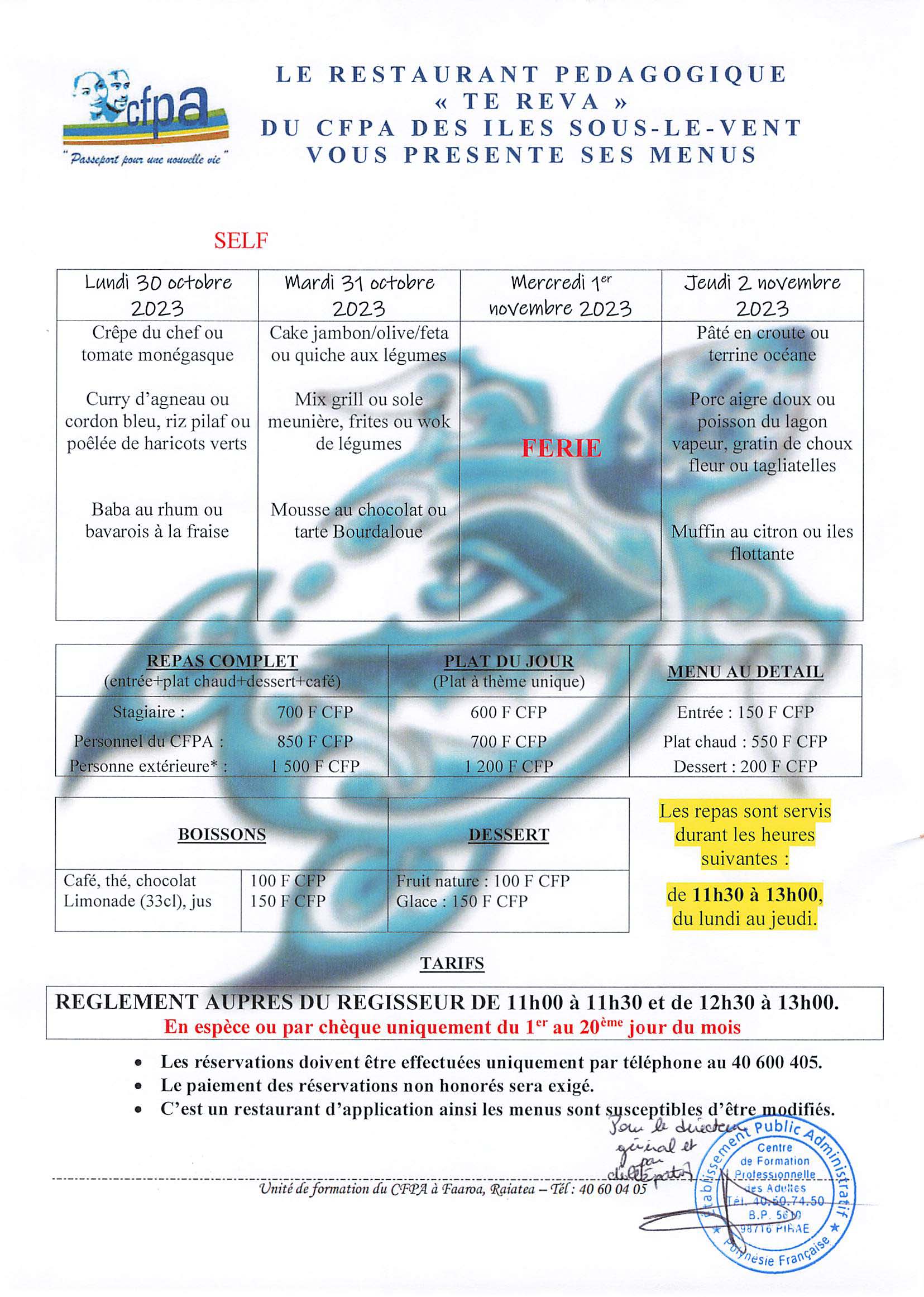 Menu du restaurant pédagogique de Faaroa du 30 Octobre au 2 Novembre 2023