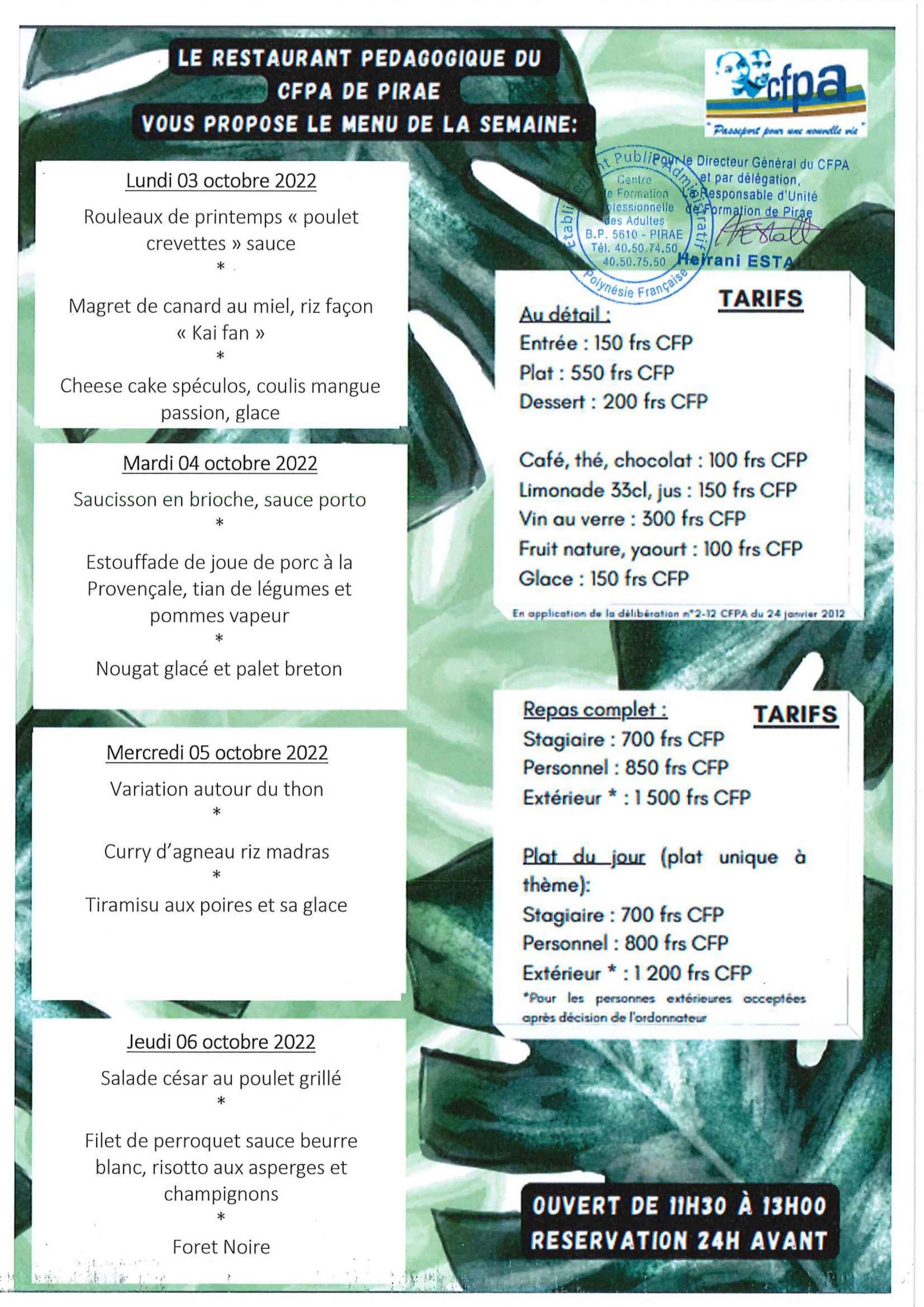 CFPA 29 septembre 2022 Menu du restaurant de Pirae Menu du restaurant pédagogique de Pirae du 03 au 06 Octobre 2022