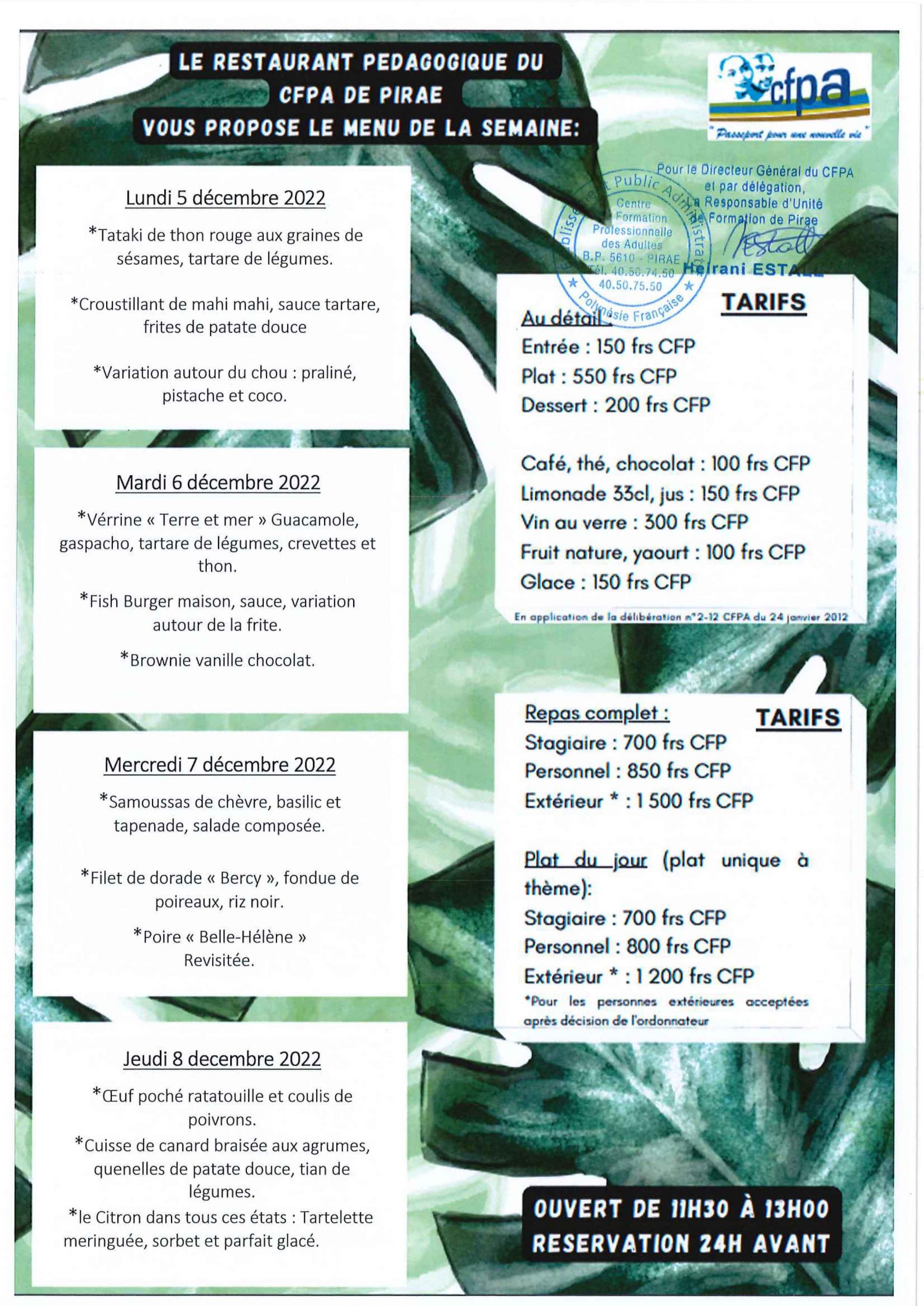 CFPA 5 décembre 2022 Menu du restaurant de Pirae Menu du restaurant pédagogique de Pirae du 05 au 08 Décembre 2022