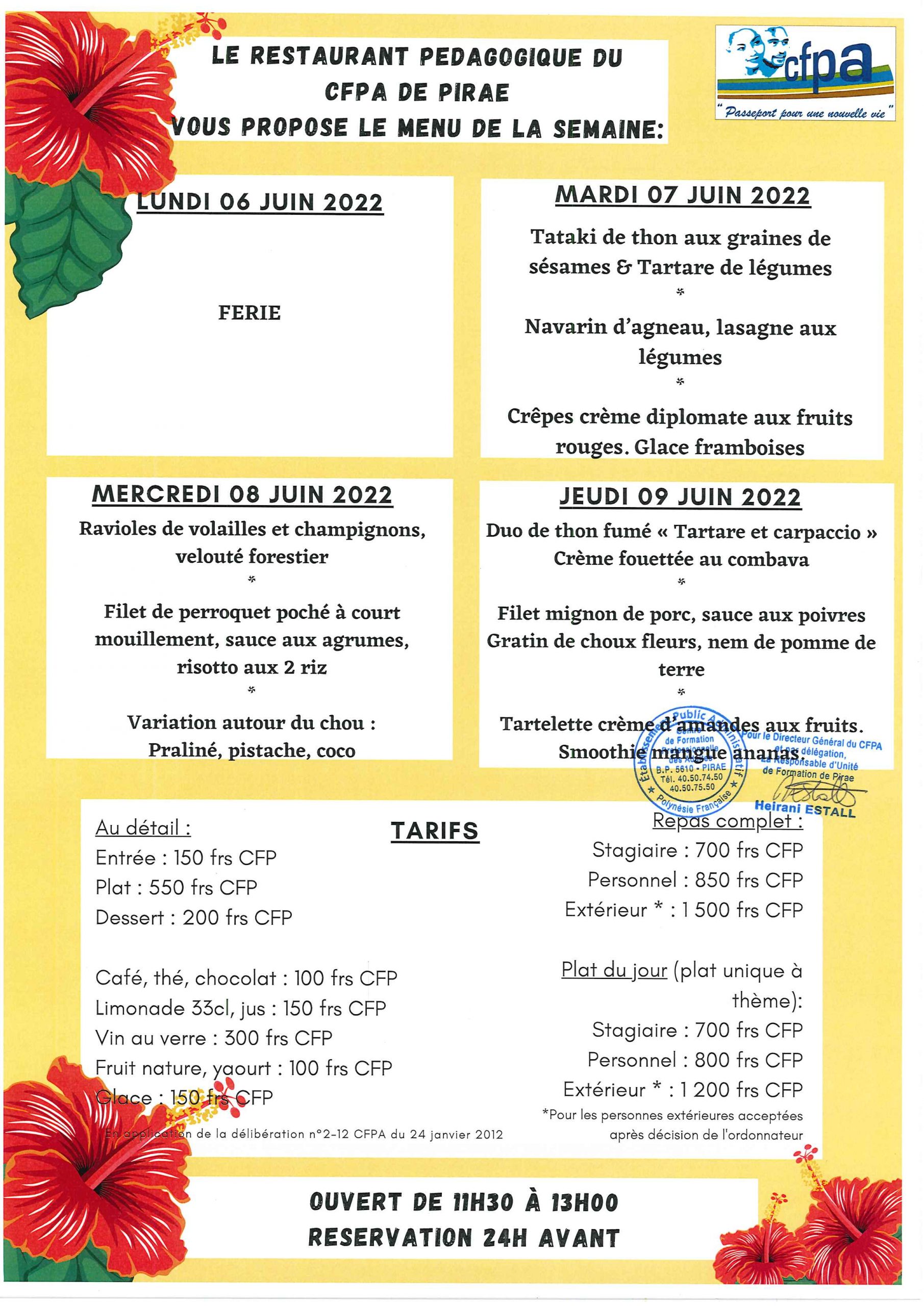 CFPA 1 juin 2022 Menu du restaurant de Pirae Menu du restaurant pédagogique de Pirae du 07 au 09 Juin 2022