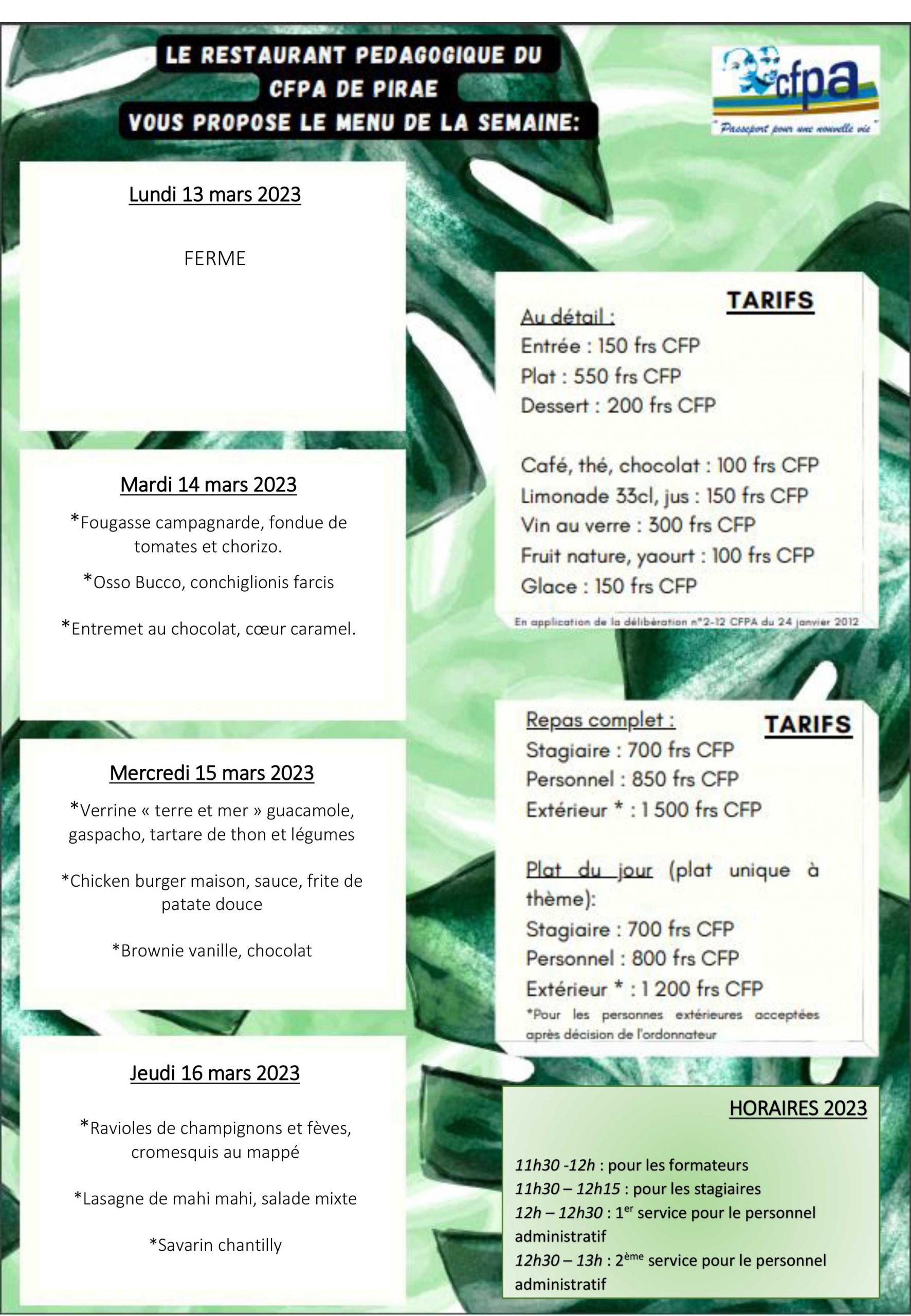 CFPA 9 mars 2023 Menu du restaurant de Pirae Menu du restaurant pédagogique de Pirae du 13 au 16 Mars 2023