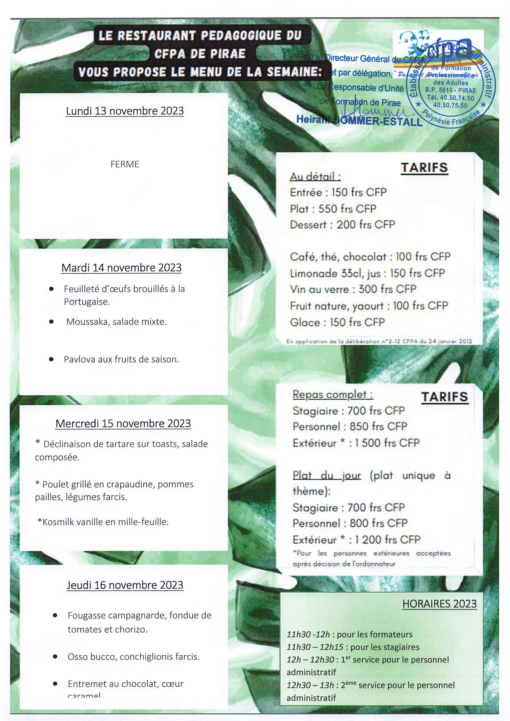 CFPA 9 novembre 2023 Menu du restaurant de Pirae Menu du restaurant pédagogique de Pirae du 13 au 16 Novembre 2023