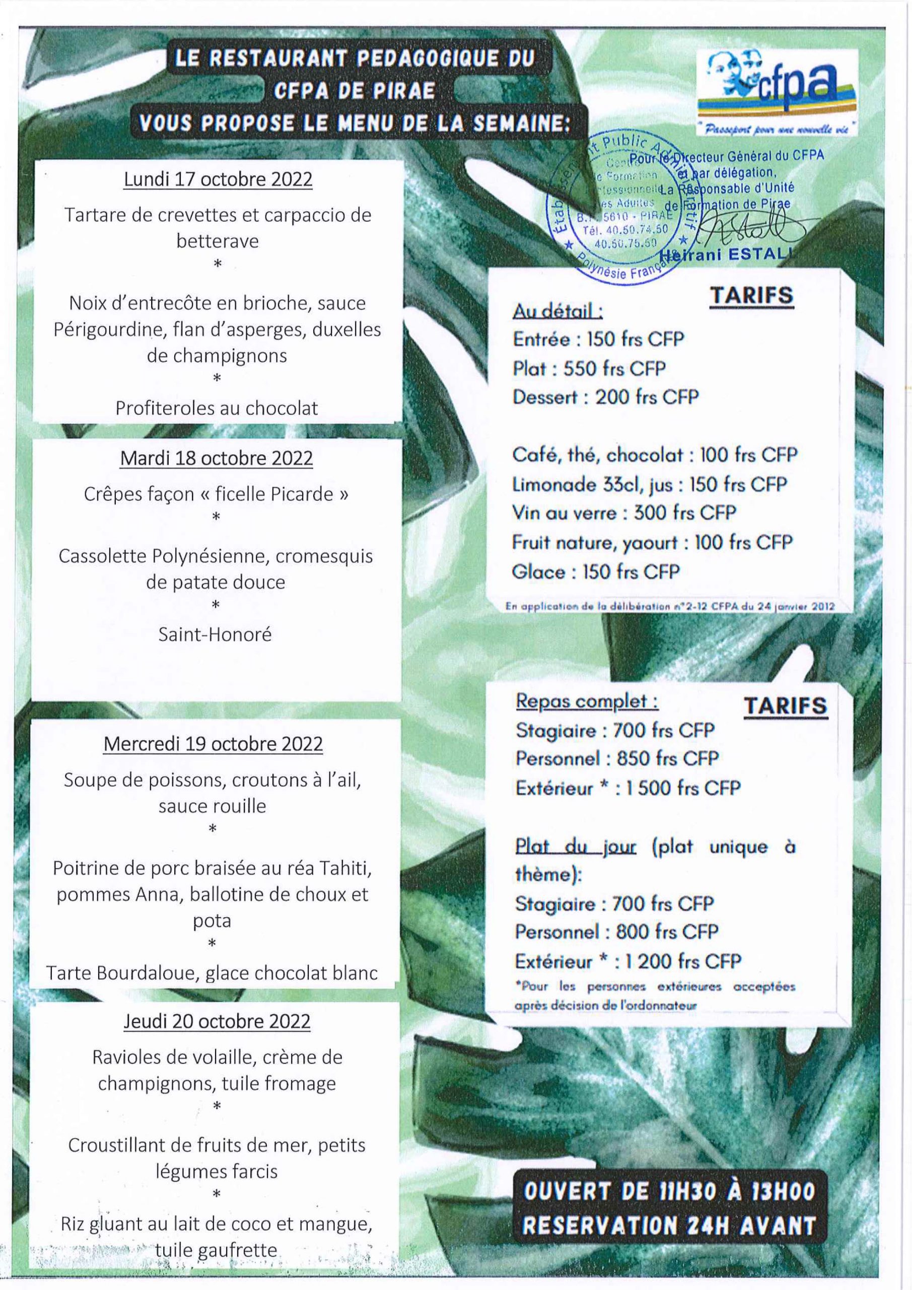 Menu du restaurant pédagogique de Pirae du 17 au 21 Octobre 2022