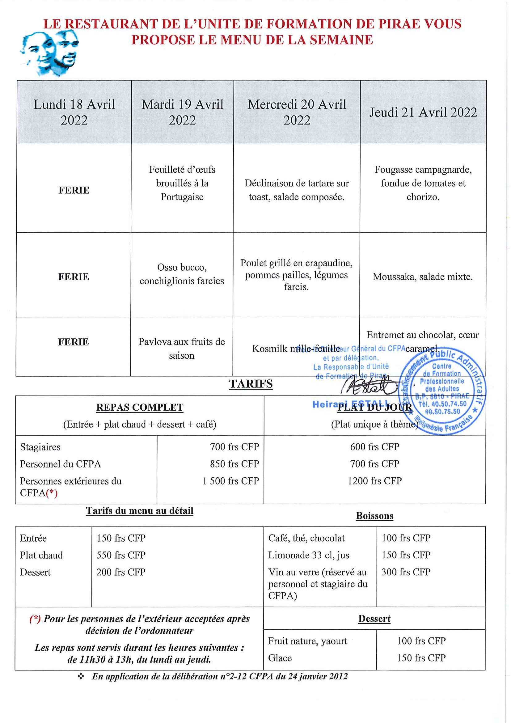 Menu du restaurant pédagogique de Pirae du 19 au 21 Avril 2022