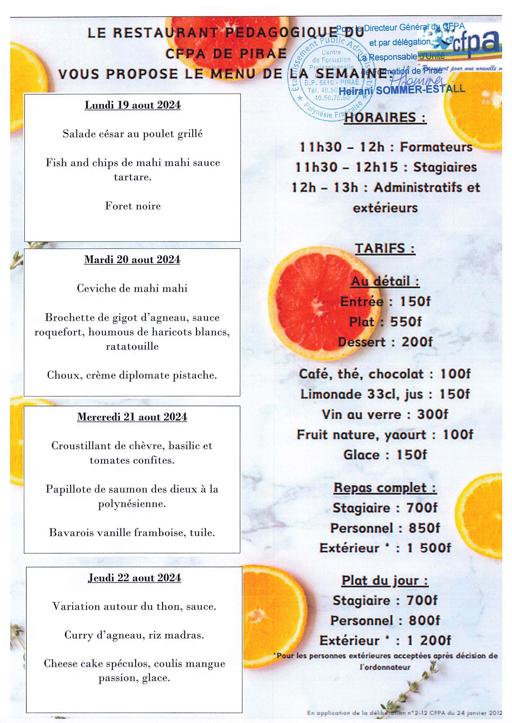 CFPA 15 août 2024 Menu du restaurant de Pirae Menu du restaurant pédagogique de Pirae du 19 au 22 Aout 2024