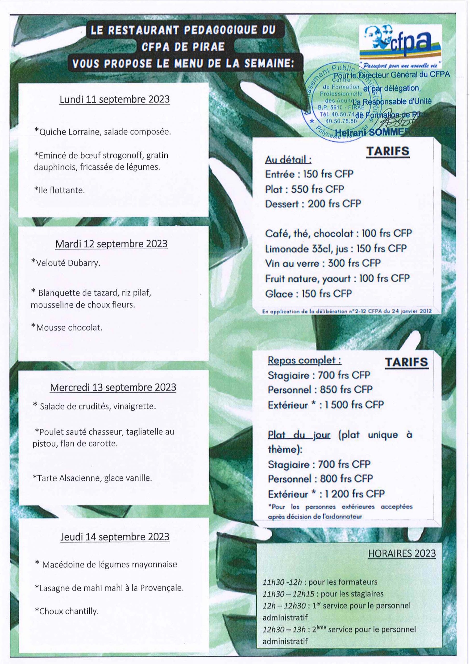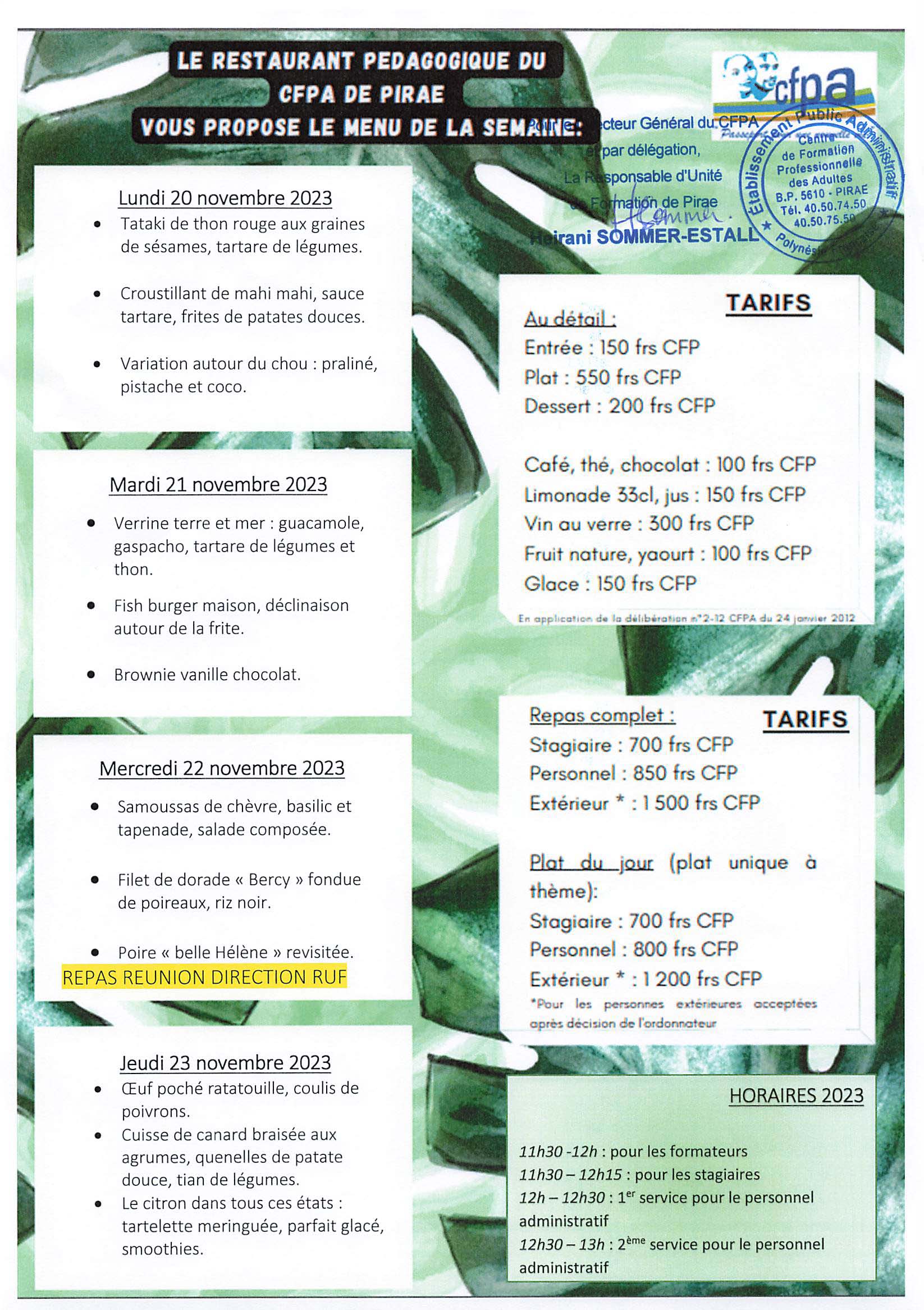 CFPA 20 novembre 2023 Menu du restaurant de Pirae Menu du restaurant pédagogique de Pirae du 20 au 23 Novembre 2023