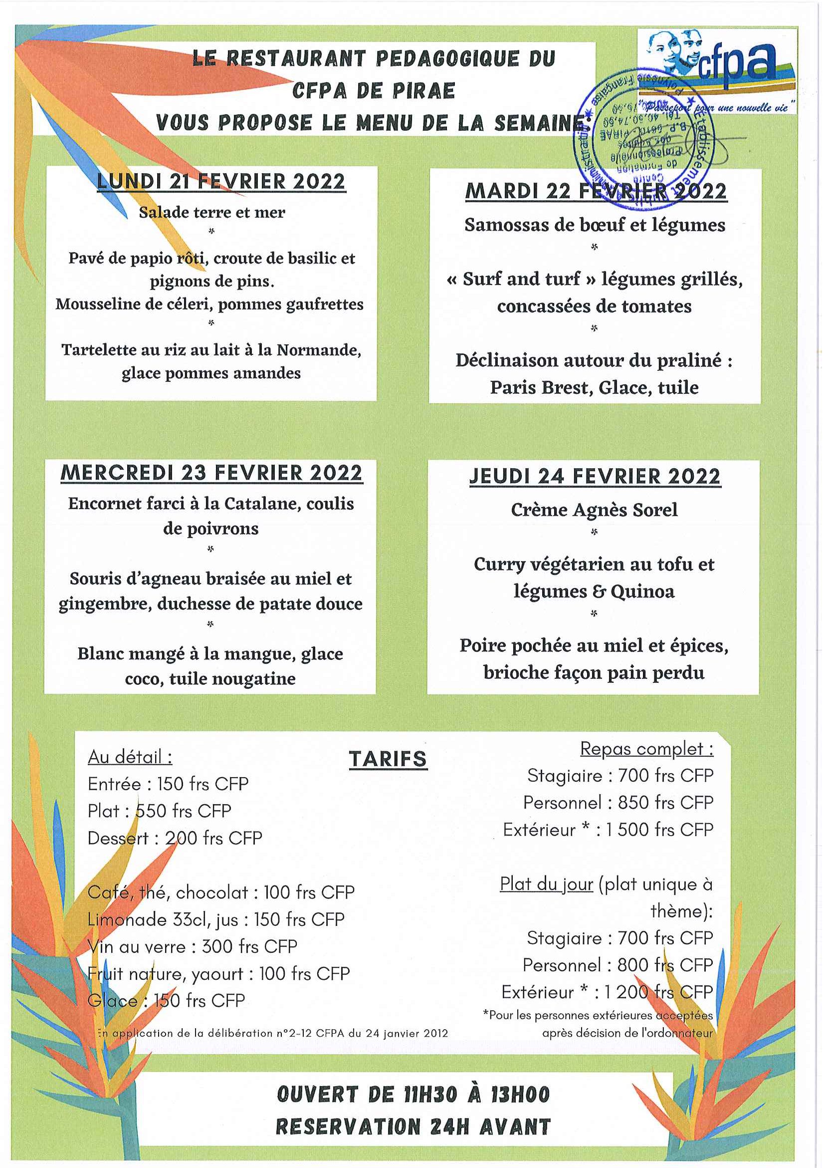 CFPA 10 février 2022 Menu du restaurant de Pirae Menu du restaurant pédagogique de Pirae du 21 au 24 Février 2022