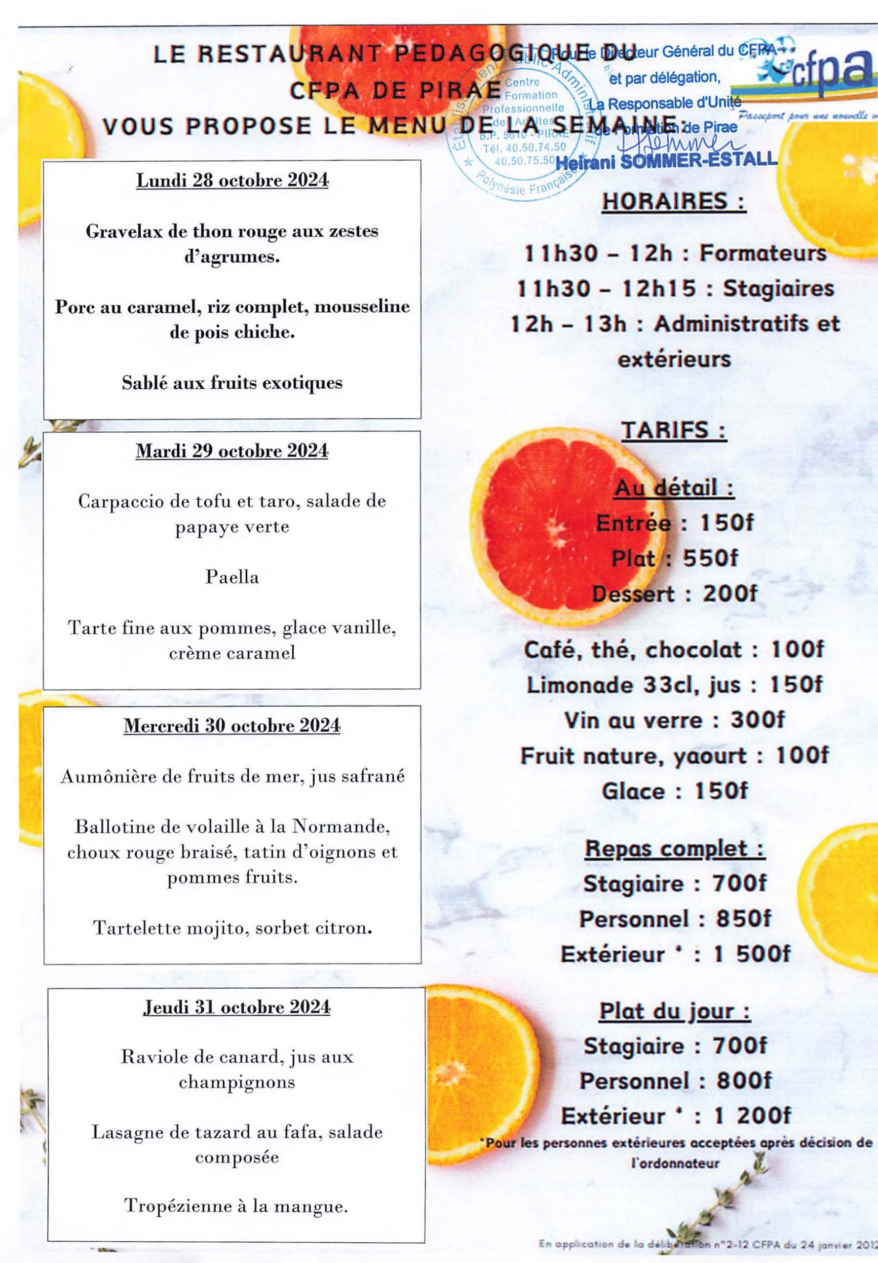 CFPA 24 octobre 2024 Menu du restaurant de Pirae Menu du restaurant pédagogique de Pirae du 28 au 31 Octobre 2024