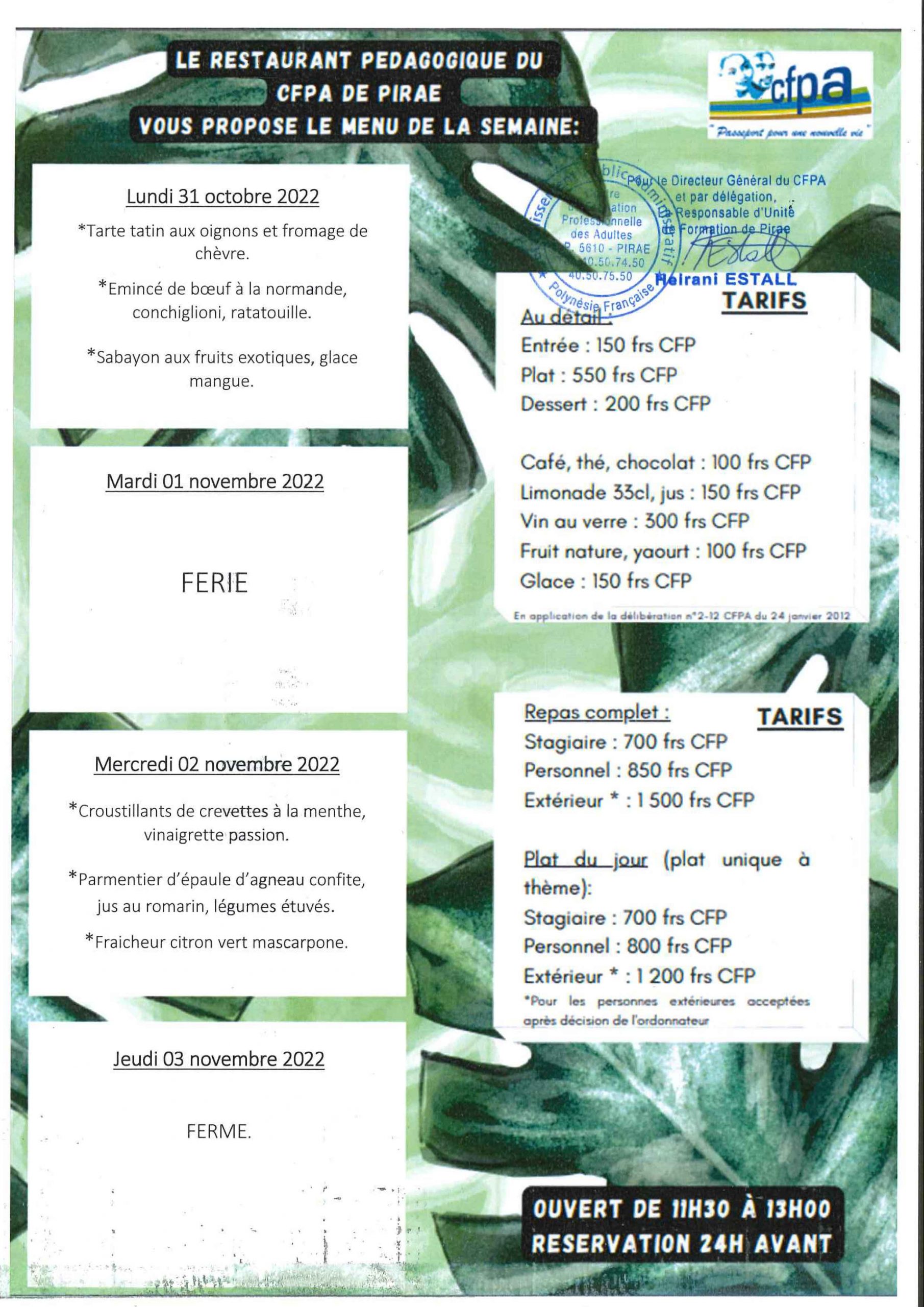 CFPA 27 octobre 2022 Menu du restaurant de Pirae Menu du restaurant pédagogique de Pirae du 31 Octobre au 04 Novembre 2022