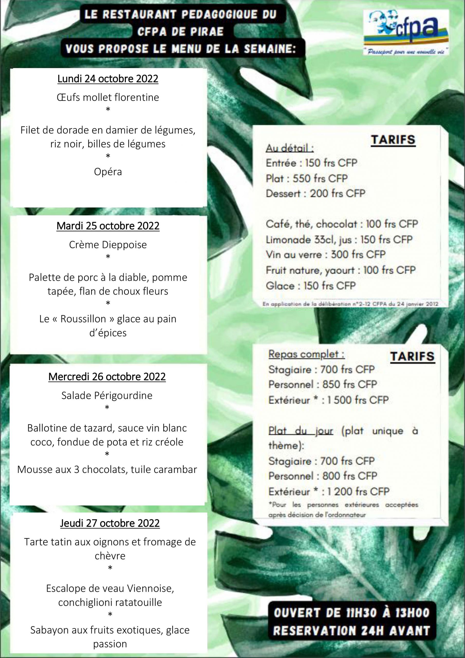 CFPA 20 octobre 2022 Menu du restaurant de Pirae Menu du restaurant pédagogique de Pirae du 24 au 28 Octobre 2022