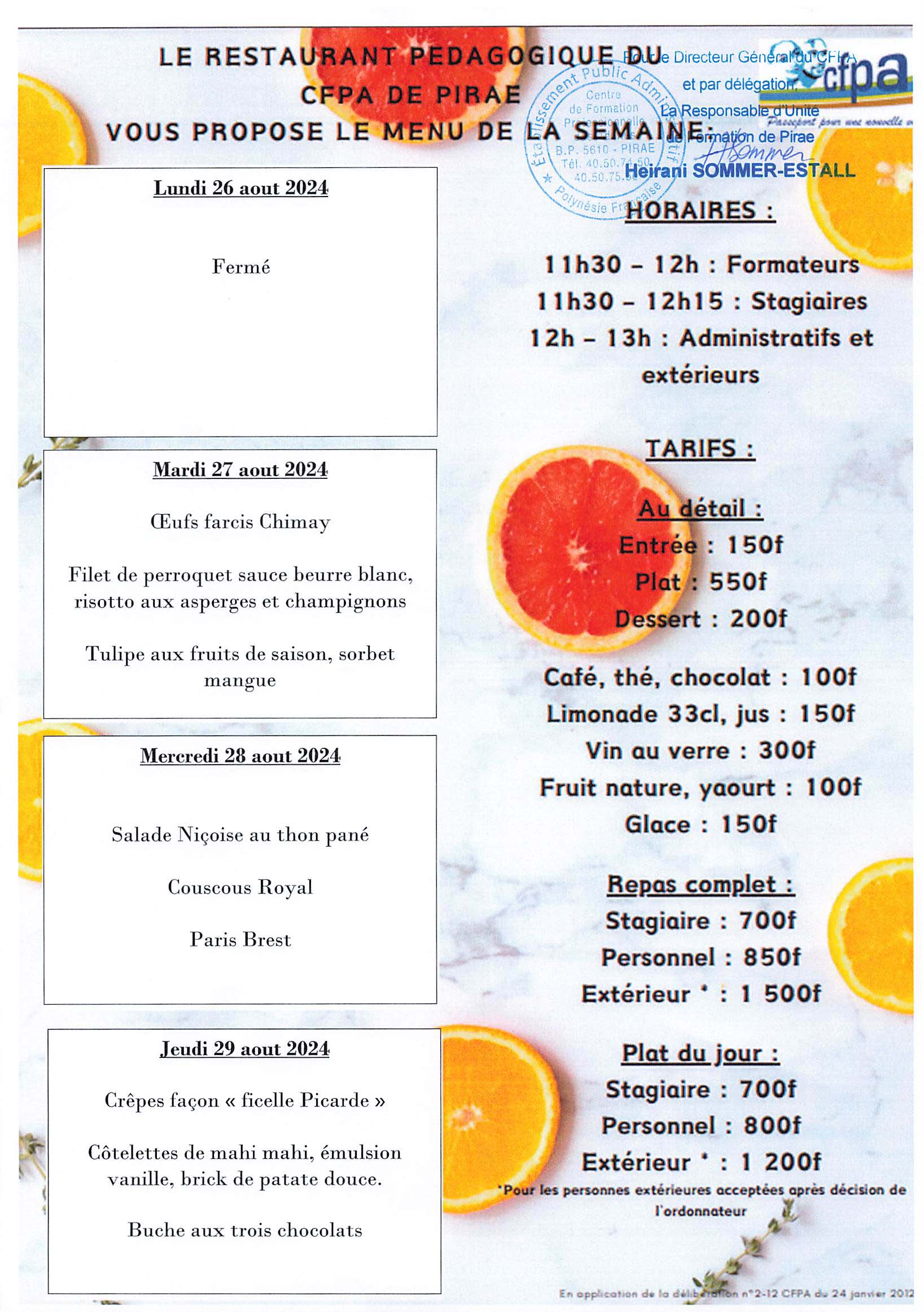 CFPA 22 août 2024 Menu du restaurant de Pirae Menu du restaurant pédagogique de Pirae du 26 au 29 Aout 2024