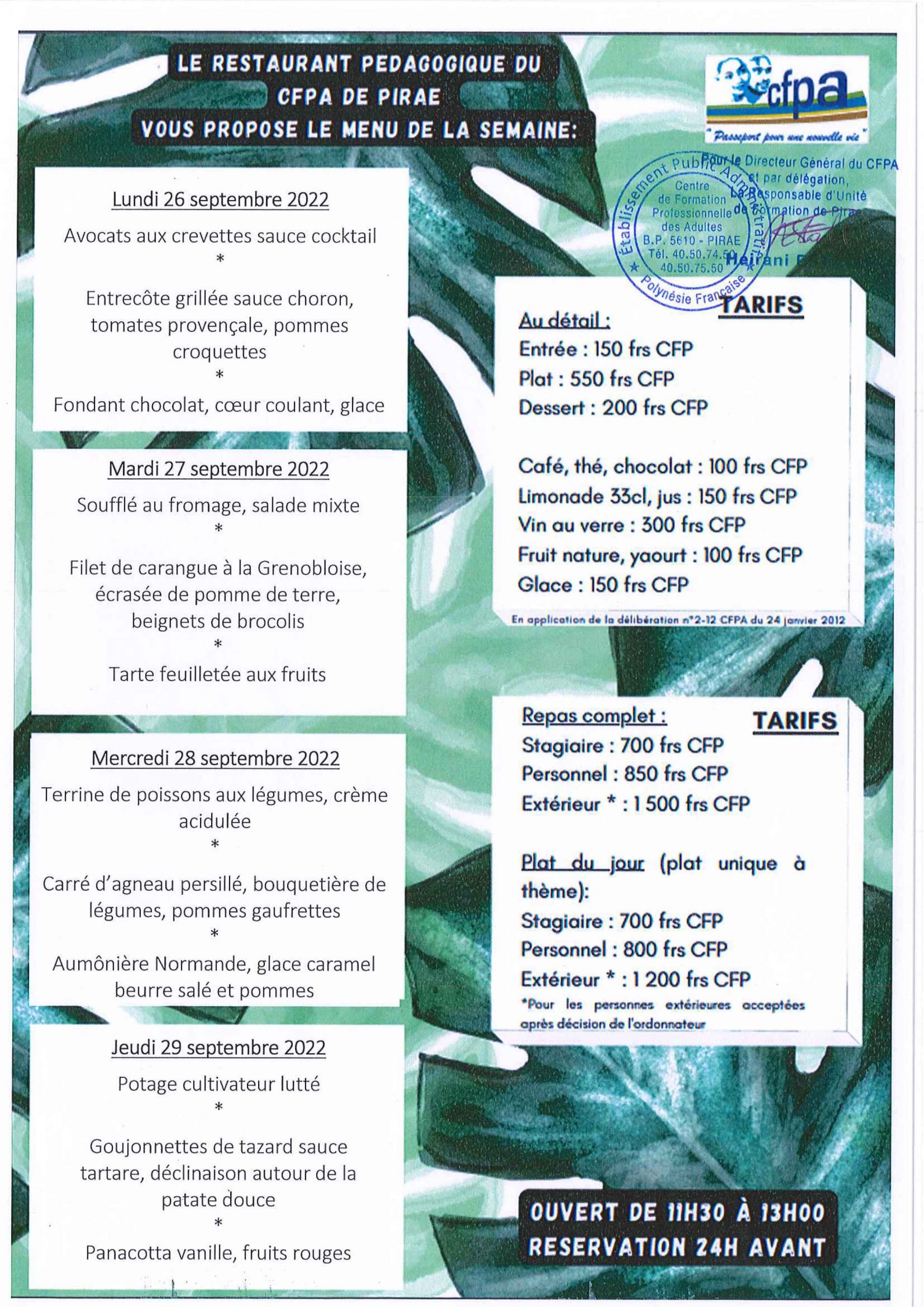 Menu du restaurant pédagogique de Pirae du 26 au 29 Septembre 2022