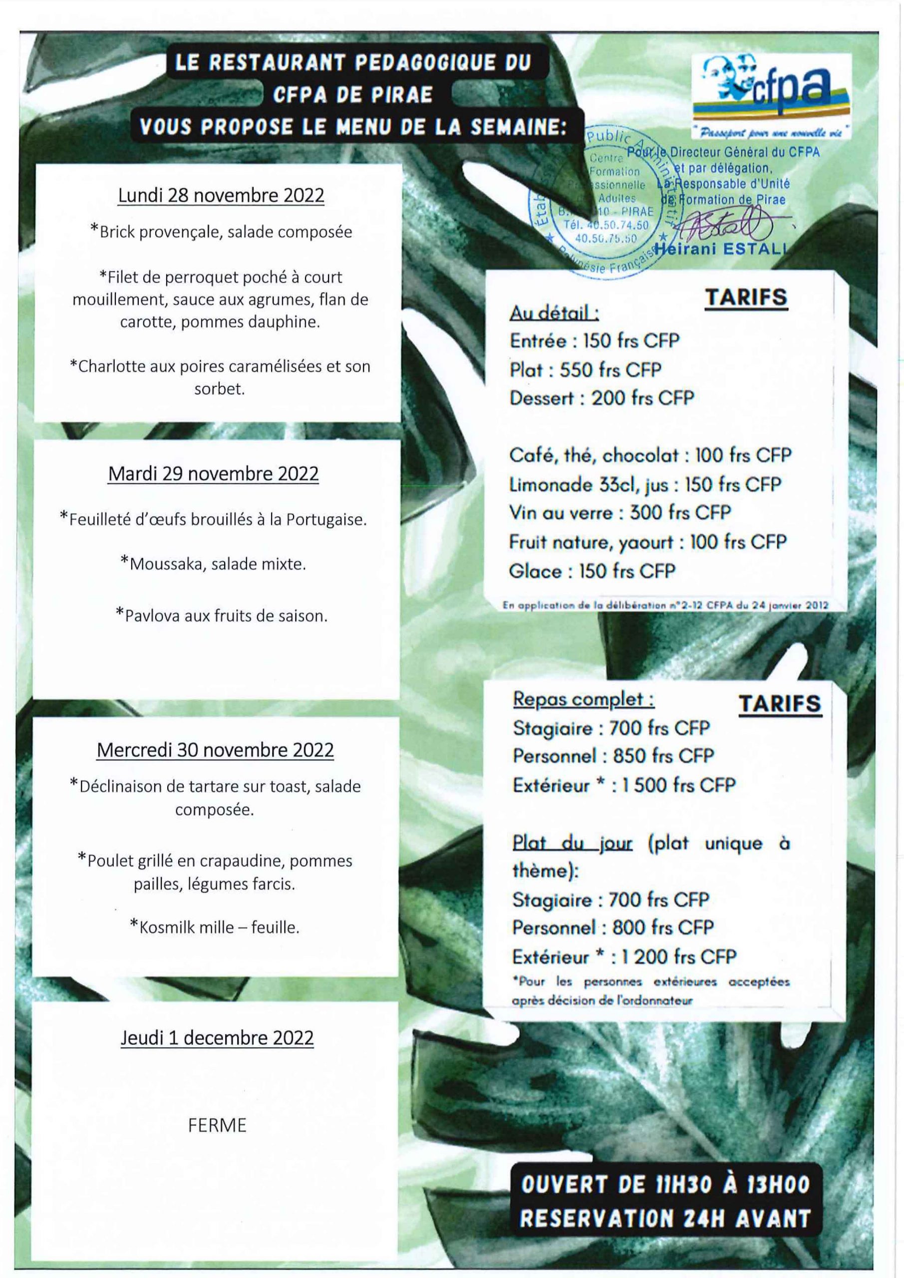 CFPA 28 novembre 2022 Menu du restaurant de Pirae Menu du restaurant pédagogique de Pirae du 28 au 30 Novembre 2022
