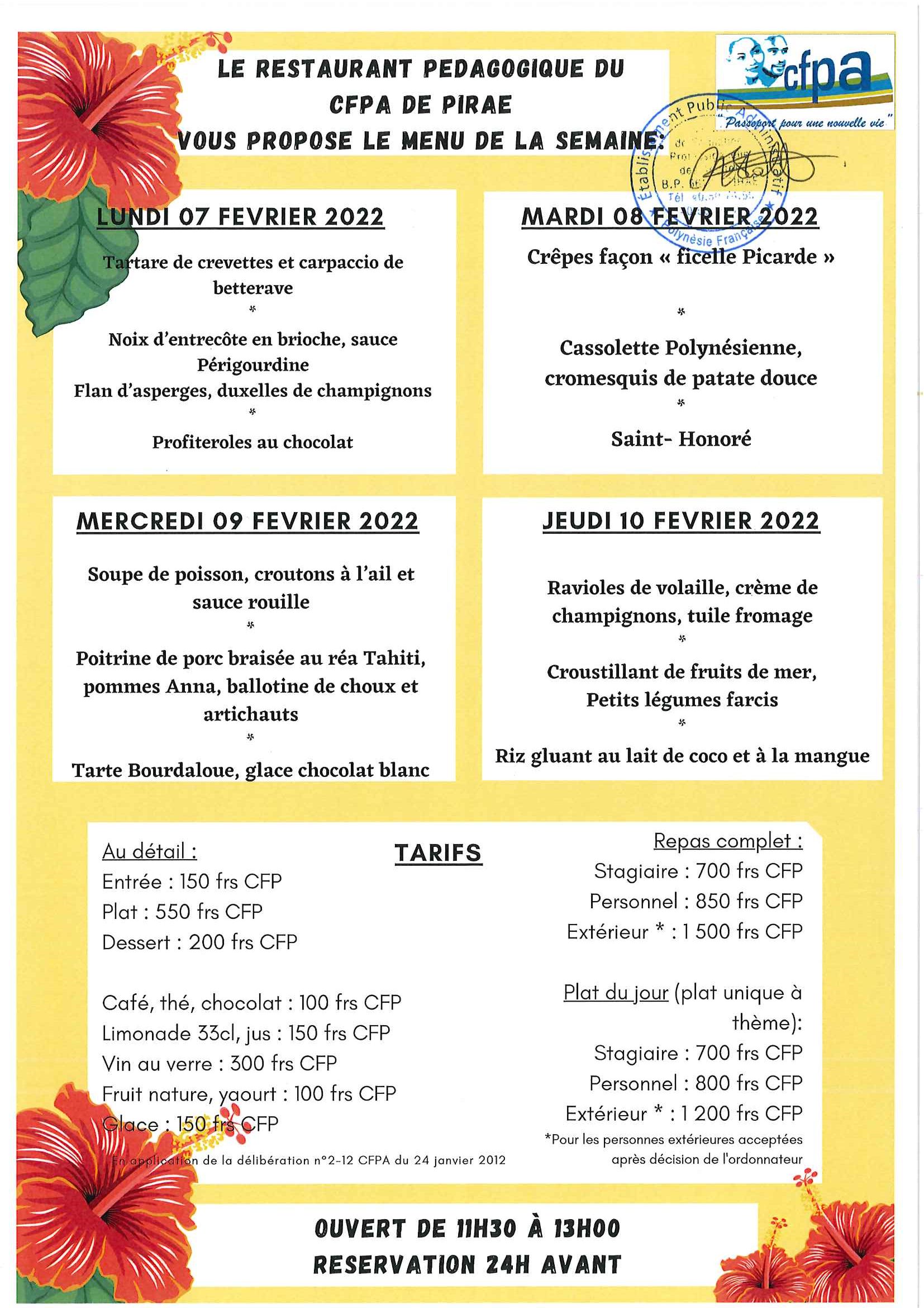 CFPA 3 février 2022 Menu du restaurant de Pirae Menu du restaurant pédagogique de Pirae du 7 au 10 Février 2022