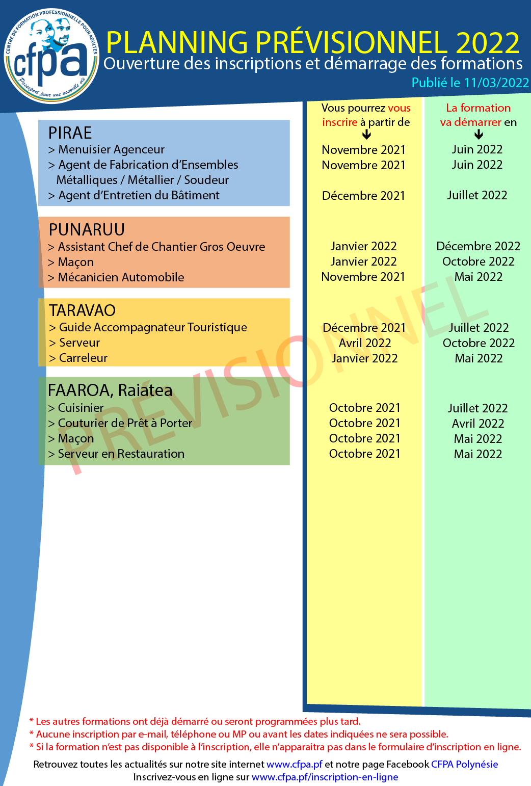 Voici le planning prévisionnel d’ouverture des inscriptions à nos formations, ainsi que les dates de démarrage des formations.