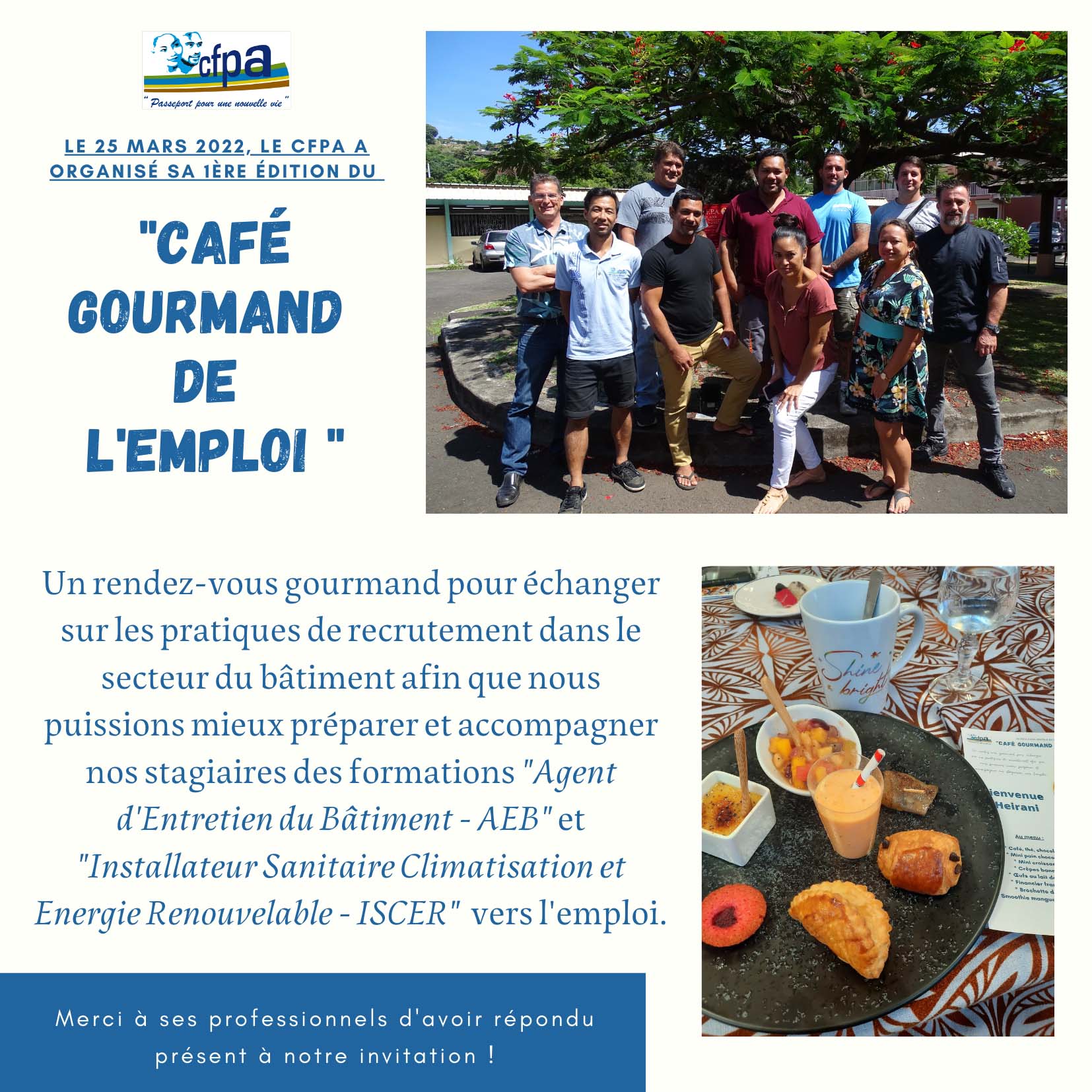 Le vendredi 25 mars, le CFPA de Pirae a organisé sa 1ere édition du « Café gourmand de l’emploi ». A l’issue de leur formation, nous accompagnons nos stagiaires vers une insertion professionnelle durable. Pour se faire ils bénéficient d’une formation complémentaire sur les techniques de recherche d’emploi (CV, LM, simulation d’entretien) ainsi qu’un suivi pendant 1 an assuré par notre Cellule Insertion.